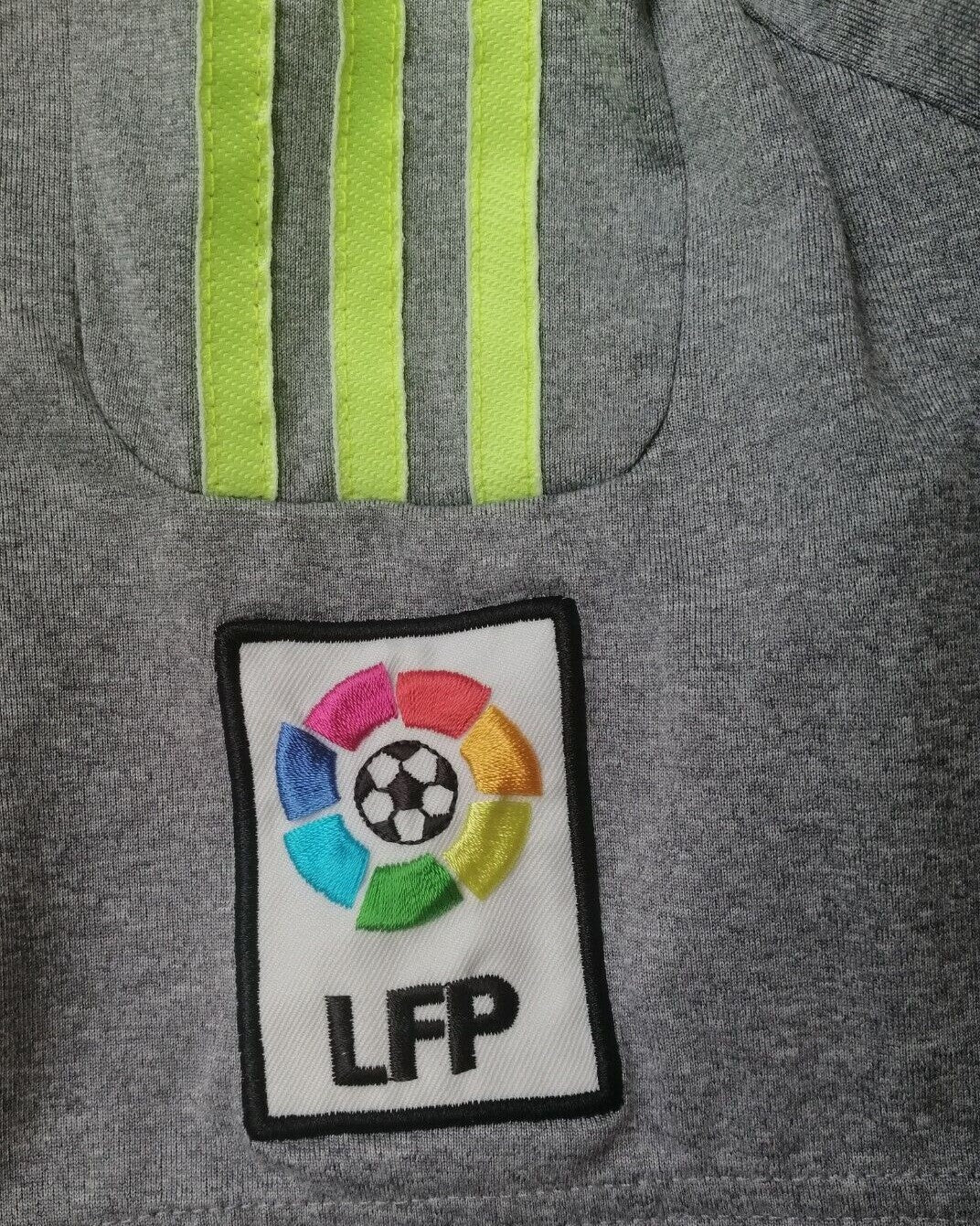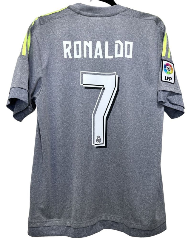 The Real Madrid shirt for the 2015-16 season, worn with the number 7 by CRISTIANO RONALDO, is made by Adidas in an eye-catching colour combination. Grey and yellow with the La Liga patch, it is enlivened by a white name and number that create a bold and eye-catching colour contrast, further highlighting the greatness of the phenomenal CR7