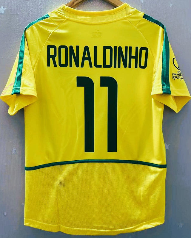 La maglia del Brasile 2002-03 con il numero 11 di RONALDINHO, rappresenta una delle più gloriose pagine del calcio brasiliano. La patch sulla manica ricorda infatti la vittoria della Coppa del Mondo in Korea e Giappone, dove il funambolico brasiliano si consacrò come stella assoluta del calcio mondiale