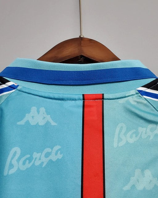 Benvenuti nella storia del calcio grazie alla maglia del Barcellona 1996-97 con il numero 9 di RONALDO. Realizzata dalle vibranti tonalità azzurre, è ulteriormente reso prestigioso dalla personalizzazione del giovane fenomeno e futuro fuoriclasse del calcio mondiale