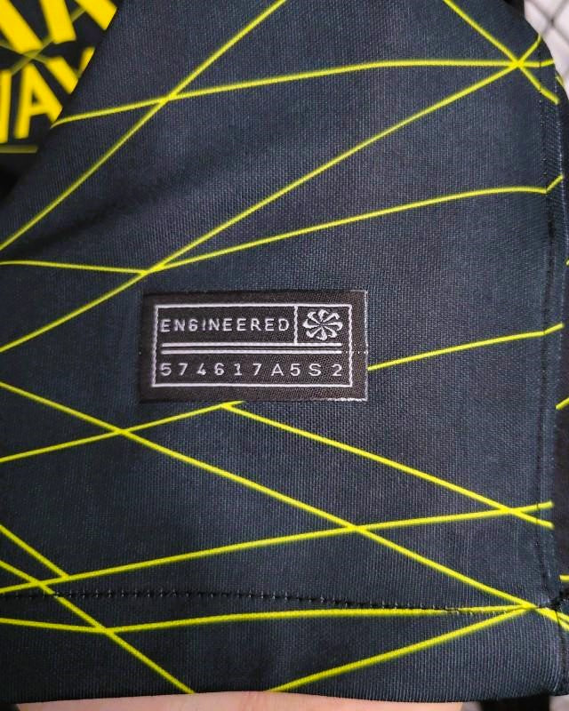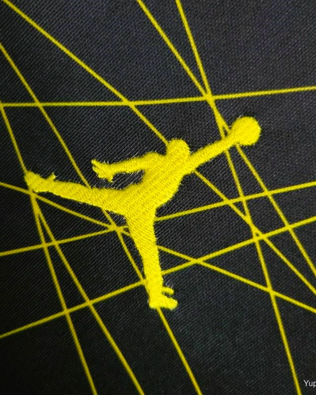 The Paris Saint-Germain jersey made by Nike Jordan for the 2022-23 season, worn with number 7 by KYLIAN MBAPPE', is a true work of art and design that celebrates the magic of Paris. In total black interrupted by thin golden stripes that pay homage to the Eiffel Tower's beams of light, it highlights the French star's name and number in yellow, further elevating its quality