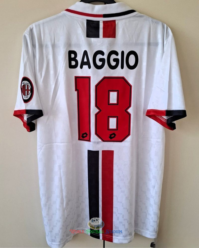 L'essenza pura della classe del calcio viene perfettamente riassunta nella maglia del Milan della stagione 1996-97 indossata con il numero 18 da ROBERTO BAGGIO. Arricchita dallo scudetto che celebra la vittoria rossonera, evidenzia la personalizzazione del "Divin Codino" ad elevarne ulteriormente il prestigio