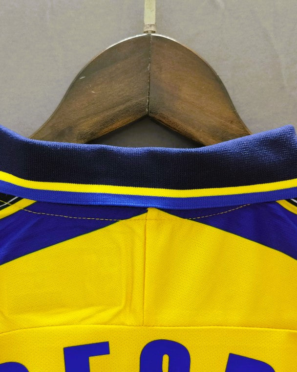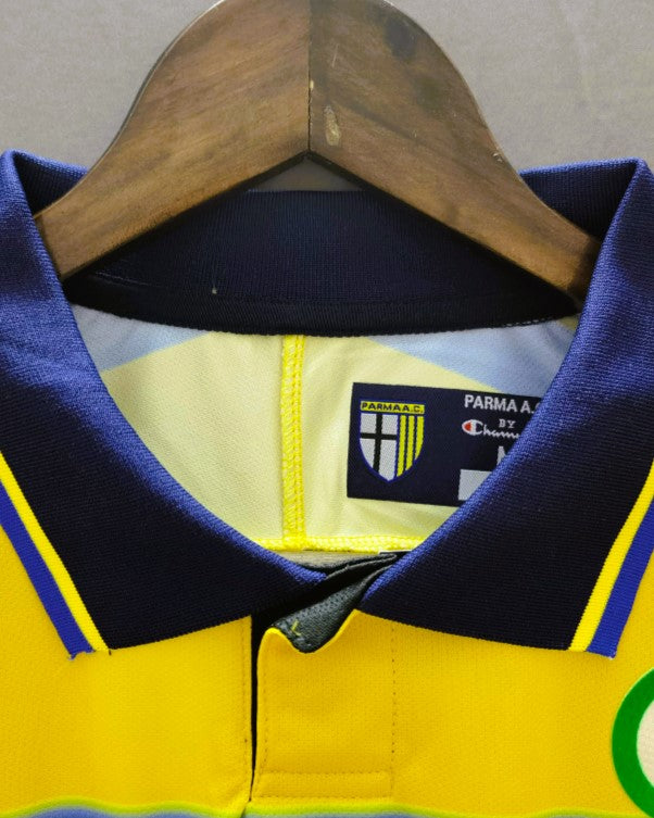 Benvenuti dalla maglia del Parma stagione 1999-00 indossata con il numero 9 da HERNAN CRESPO. Con strisce orizzontali gialle e blu e arricchita dalla coccarda che testimonia la vittoria in Coppa Italia, rappresenta il culmine della storia del club emiliano con questa perla indossata dal fenomenale argentino