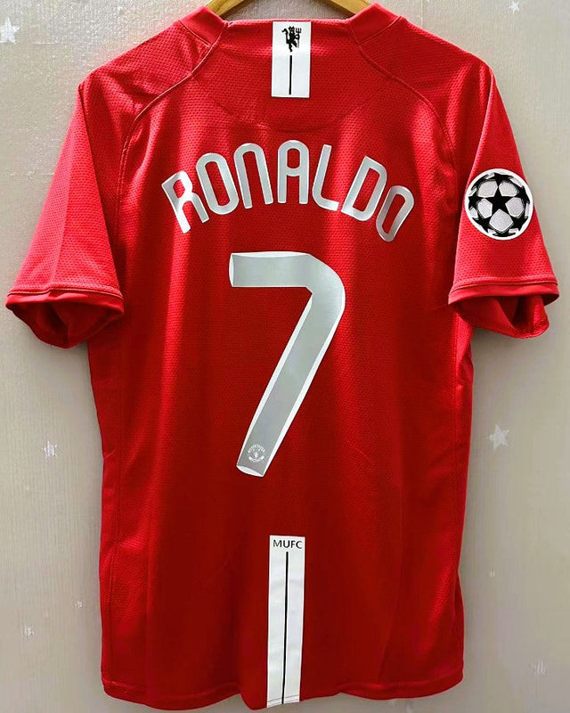 La maglia del Manchester United con il numero 7 di CRISTIANO RONALDO, rappresenta al meglio la forza dei Red Devils nella stagione 2007-08. Arricchita dalla scritta che celebra il trionfo in Champions League e dalla sua patch, ha la personalizzazione del fuoriclasse portoghese ad aggiungere ulteriore prestigio a questa divisa straordinaria