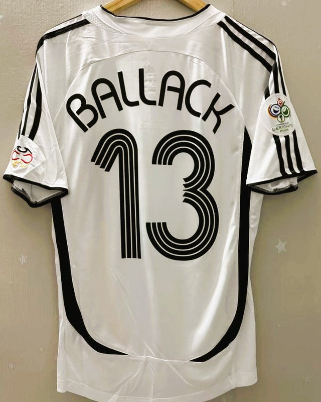 Una delle più belle maglie mai realizzate, quella della Germania stagione 2006-07 con il numero 13 di MICHAEL BALLACK. Un candido bianco interrotto da inserti gialli rossi e neri a richiamare la bandiera tedesca, la patch di Germany 2006 a evocare i mondiali e il talento del fenomenale centrocampista a elevare ulteriormente la qualità di questo autentico capolavoro