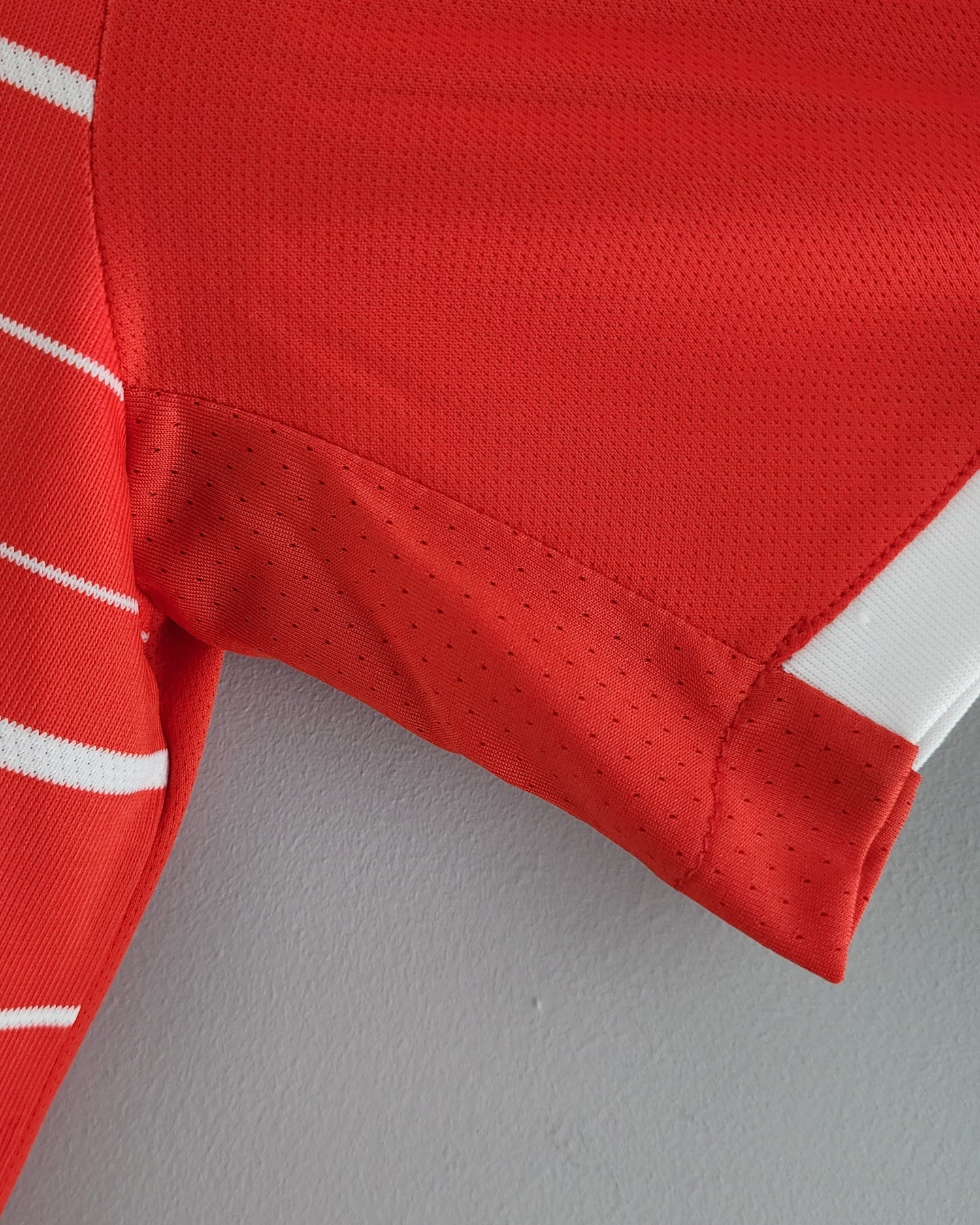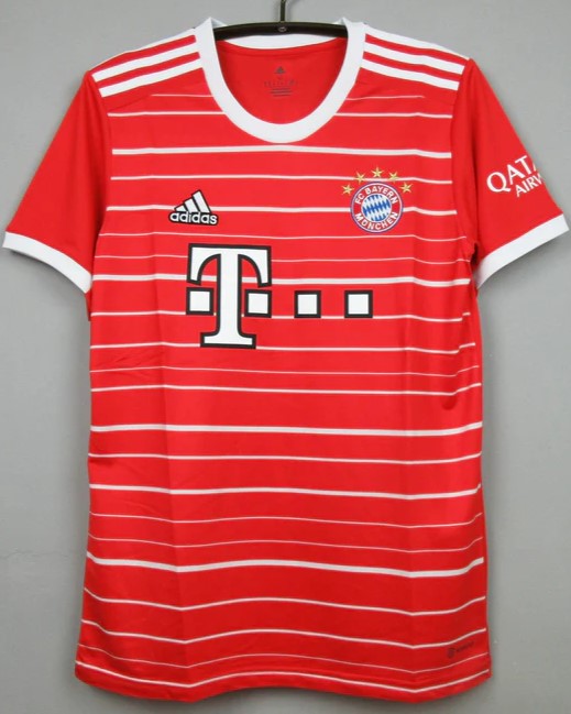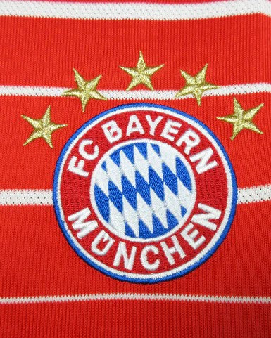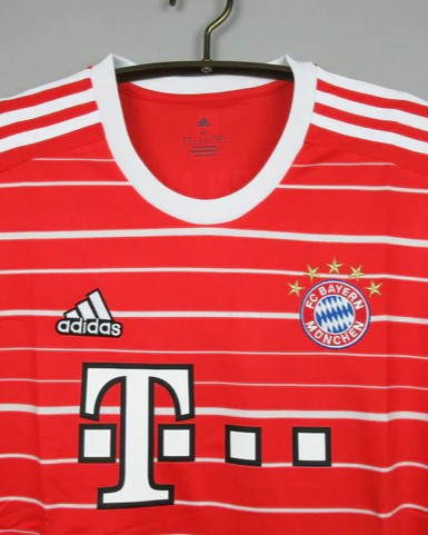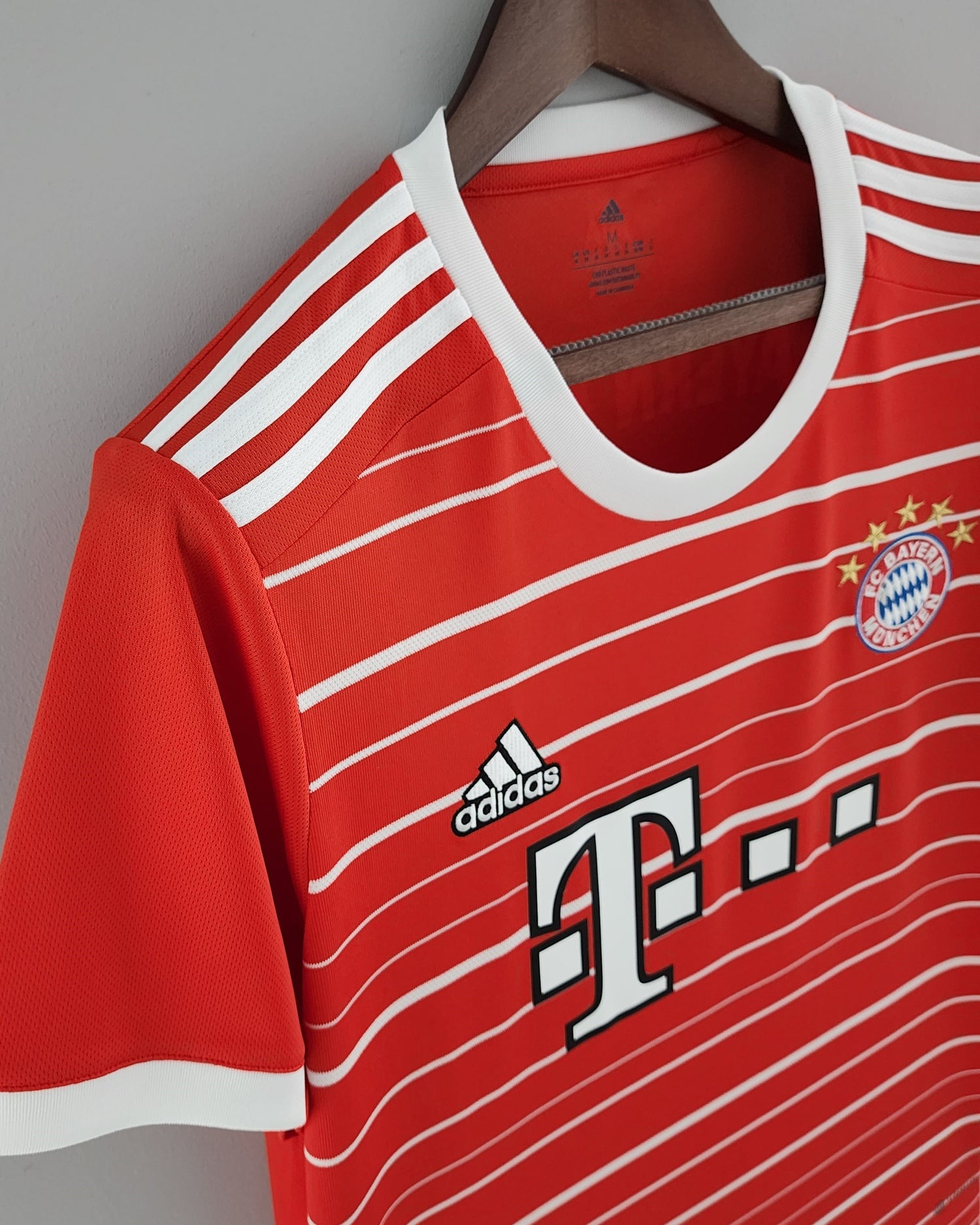Rive Bayern Munich history with the 2022-23 season shirt featuring the number 4 of MATTHIJS DE LIGT. A design masterpiece created by Adidas, with the flamboyant red colour embraced by white inserts highlighting the strength and tenacity of the Bavarian club and its strong Dutch centre-back at the highest level