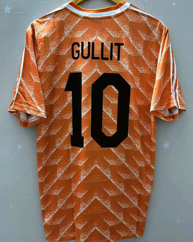 The 1988-89 Netherlands jersey, worn with number 10 by RUUD GULLIT, is a true icon of world football. Made in traditional orange with refined black details for the name and number, it represents the essence of the Dutch team that won at Euro '88, combining tradition and innovation in a design masterpiece that is more relevant than ever