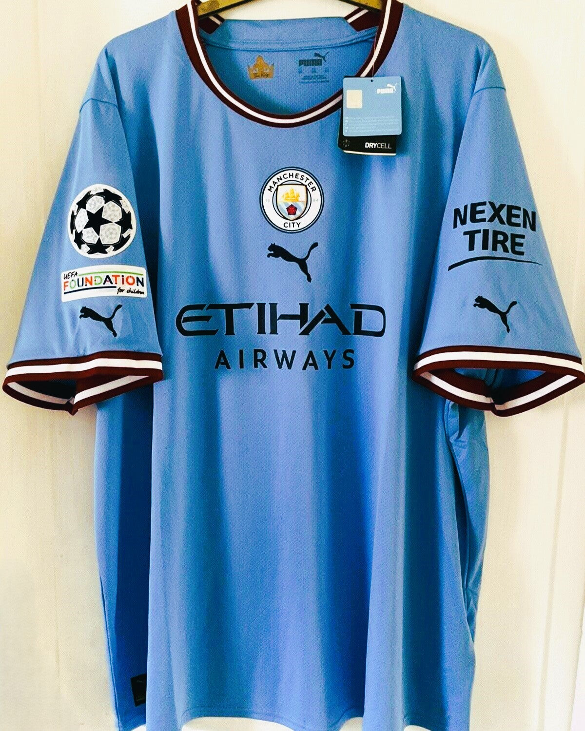 La maglia del Manchester City realizzata nel 2022-23 con il numero 9 di ERLING HAALAND, testimonia la leggenda del calcio. E' la celebrazione del Treble, dei trionfi dei Citizens guidati dal fenomenale attaccante norvegese con le patch della Champions League che ne testimoniano il trionfo europeo